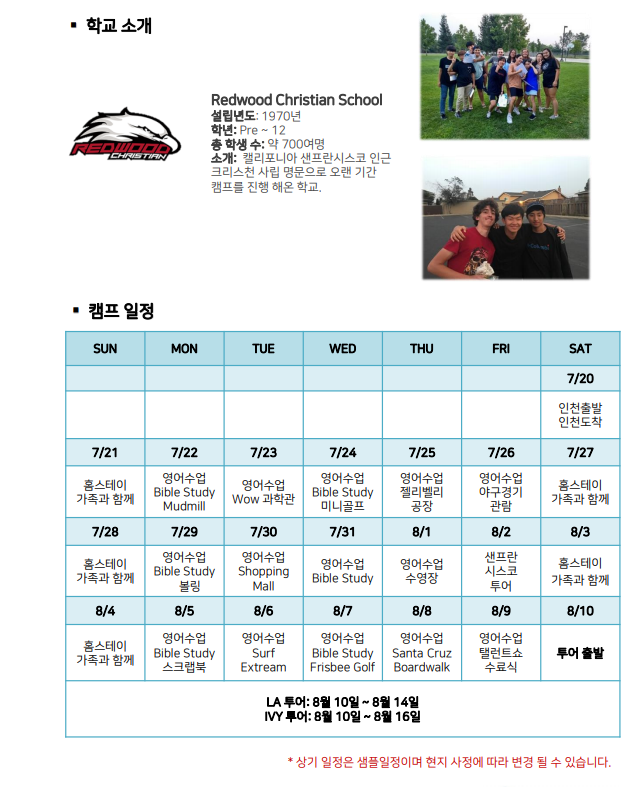 캘리포니아 샌프란시스코 인근 크리스천 사립 명문으로 오랜 기간 캠프를 진행한 학교 입니다.