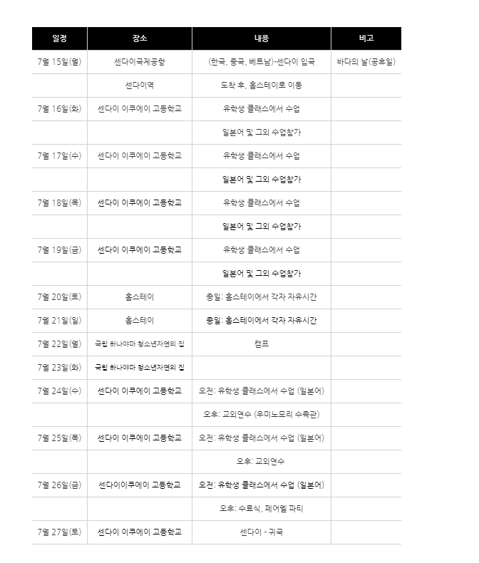 ● 일본캠프 일정: 2019년 07월 13일(토) ~ 2019년 07월 27일(토)