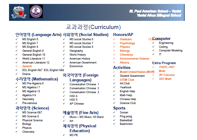 -미국 본교 (St.Paul Preparatory School)와 동일한 교과과정및 학사 운영 지침