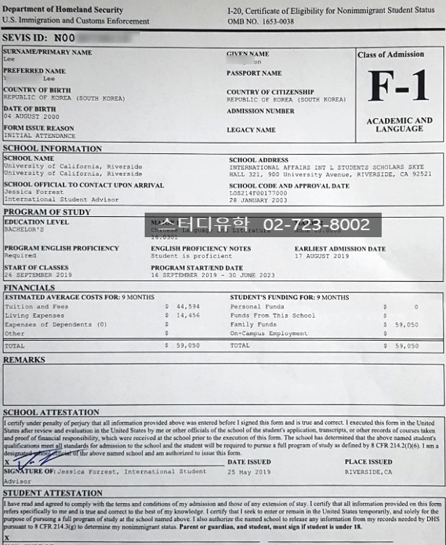 이* 학생은 University of California Riverside대학 입학 허가서랍니다. 스터디디 유학에서 비자업무를