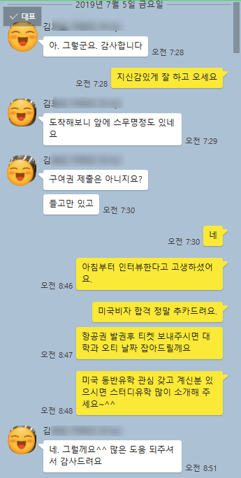 7월 5일 미국비자 합격후 스터디 유학과 나눈 카톡 내용 올려 드립니다.