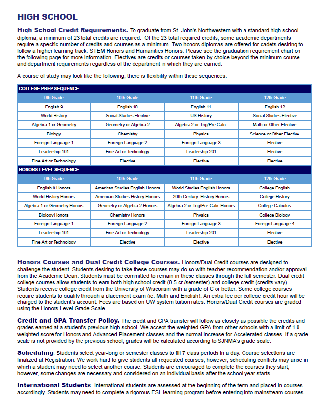 ST. JOHN’S NORTHWESTERN ACADEMIES는 학문, 리더십 기술, 정신, 인격 발달에 대한 핵심적인 헌신을 통해 최고의 개인적 잠재력을 성취할 수 있는 젊은 성인이 되도록 준비시킵니다.