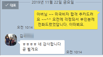 11월 22일 미국대사관 합격 소식을 전화로 알려주시고 , 스터디유학 출발전 카톡 대화 랍니다.