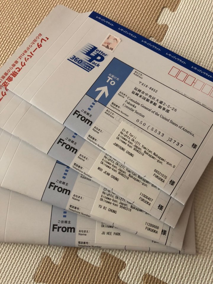 다시 호쿠오카미국대사관으로 예약한 인터뷰날짜보다 일주일 빨리 보내야 합니다. 그렇지 않으면 인터뷰가 불가능해요. 일본에는 동경,오사카, 후쿠오카 , 사뽀로에 미국대사관이 있는데 호쿠오카와 사뽀로만 일주일전에 서류를 대사관으로 보내야 합니다. 일본에서 미국비자 인터뷰 보시는분들 참고하세요 ~~