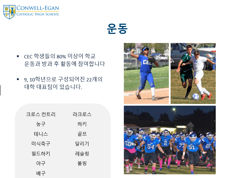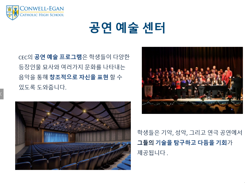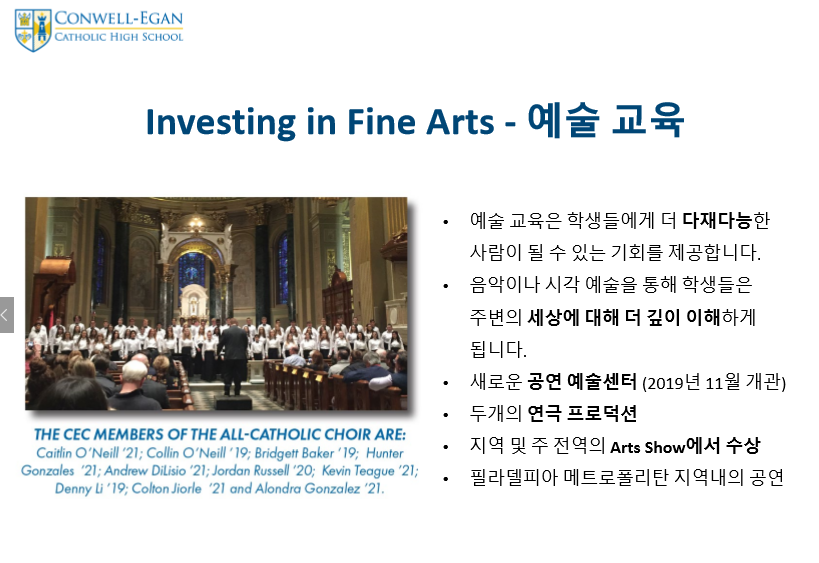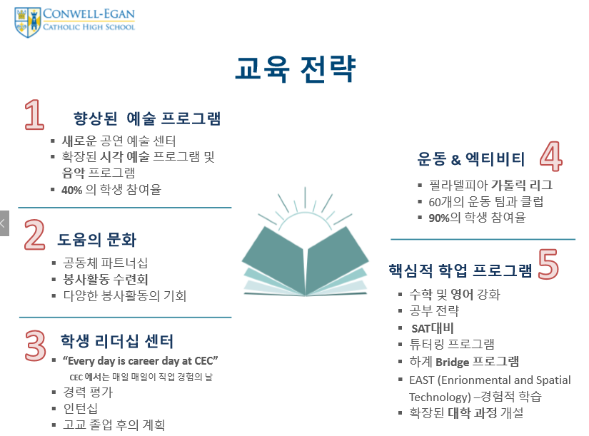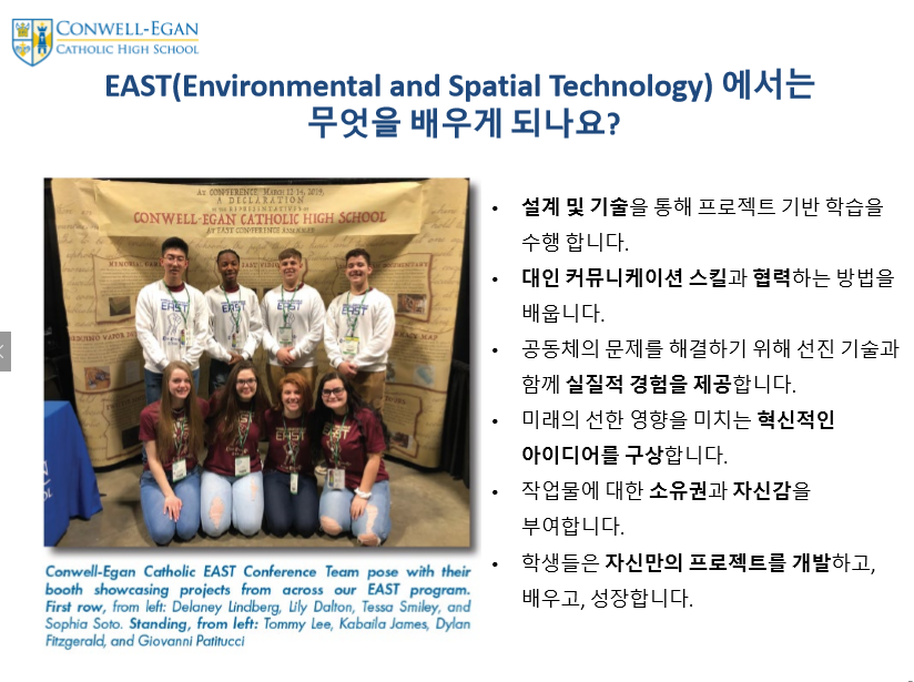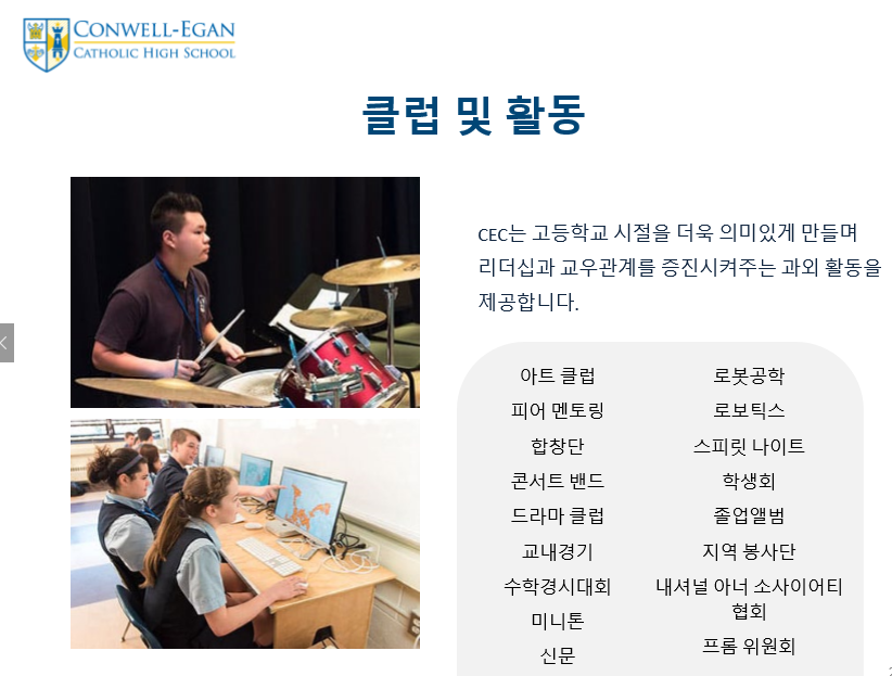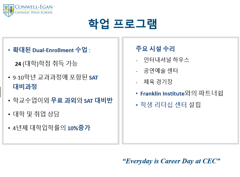 제가 직접 Conwell Egan Catholic High School 방문했을때 느꼈던 장점중 가장 인상 깊다고 생각한건 학생리더쉽 스킬을 개발 시키는 다양한 프로그램입니다.