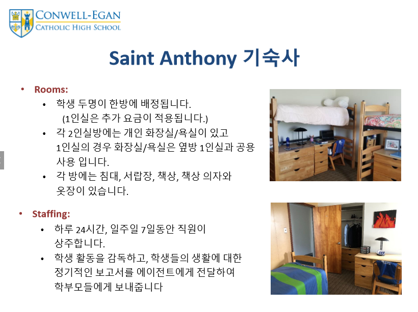 스터디유학은 Conwell Egan Catholic High School을 직접 다녀 왔으며 2020년 9월학기 학생은 새롭게 리노베이션된 깨끗한 학교 시설을 이용하게 됩니다.