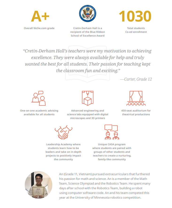 블루리본 수상 미네소타 트원시티 2020년 9월 입학 Cretin Derham Hall High School 소개
