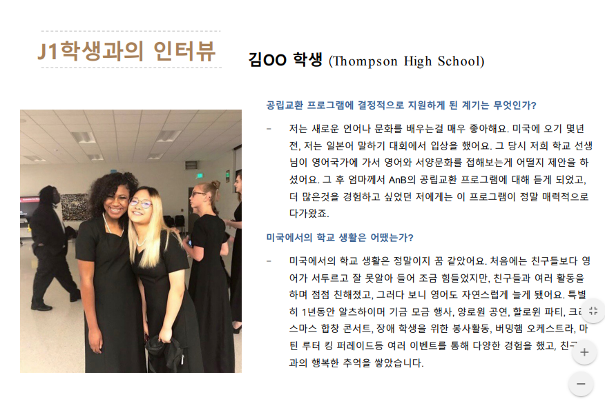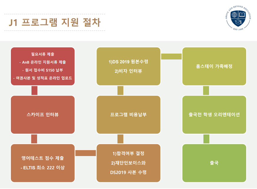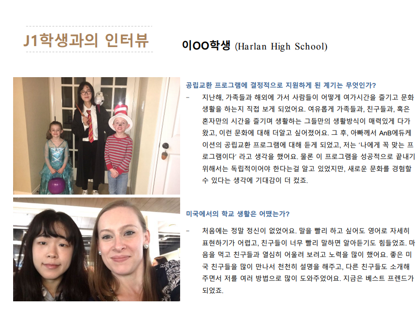 마지막으로 이 프로그램이 성공하기 위해서는 좋은 재단을 선택해야 합니다. 좋은 학교와 호스트는 재단에 의해서 결정되기 때문입니다. 저희 AnB 교육재단은 J1재단들중 유일무이하게 Korean-American 으로 구성된 경영진을 가진 비영리 교육 단체 입니다. 누구보다도 한국 학생들과 파트너 유학원들을 잘 이해하고 돕는 재단임을 자신 합니다!