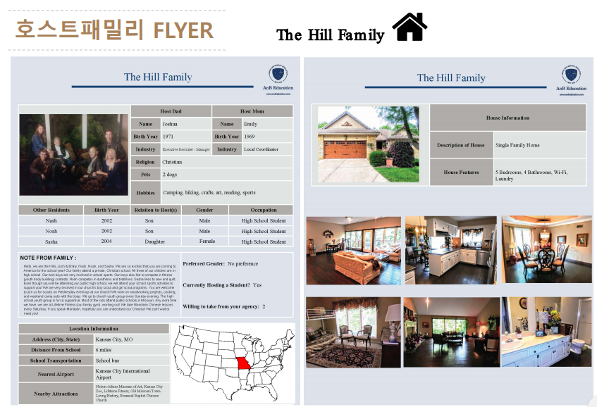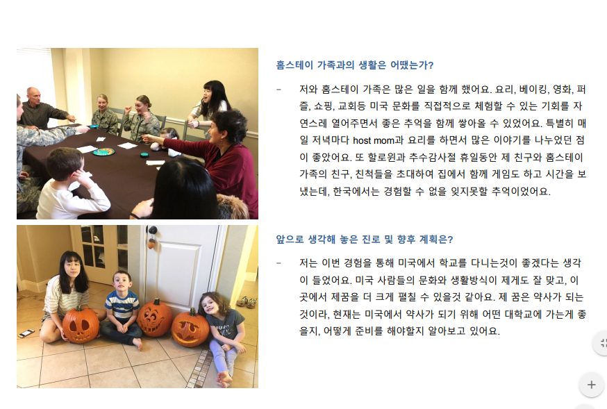 프로그램에 참여한 학생들은 미국 학생들과 함께 수업에 참가 할 수 있고 , 숙식은 미국의 자원봉사자로 등록된 가정 ( host family) 에서 무료로 지원 됩니다.