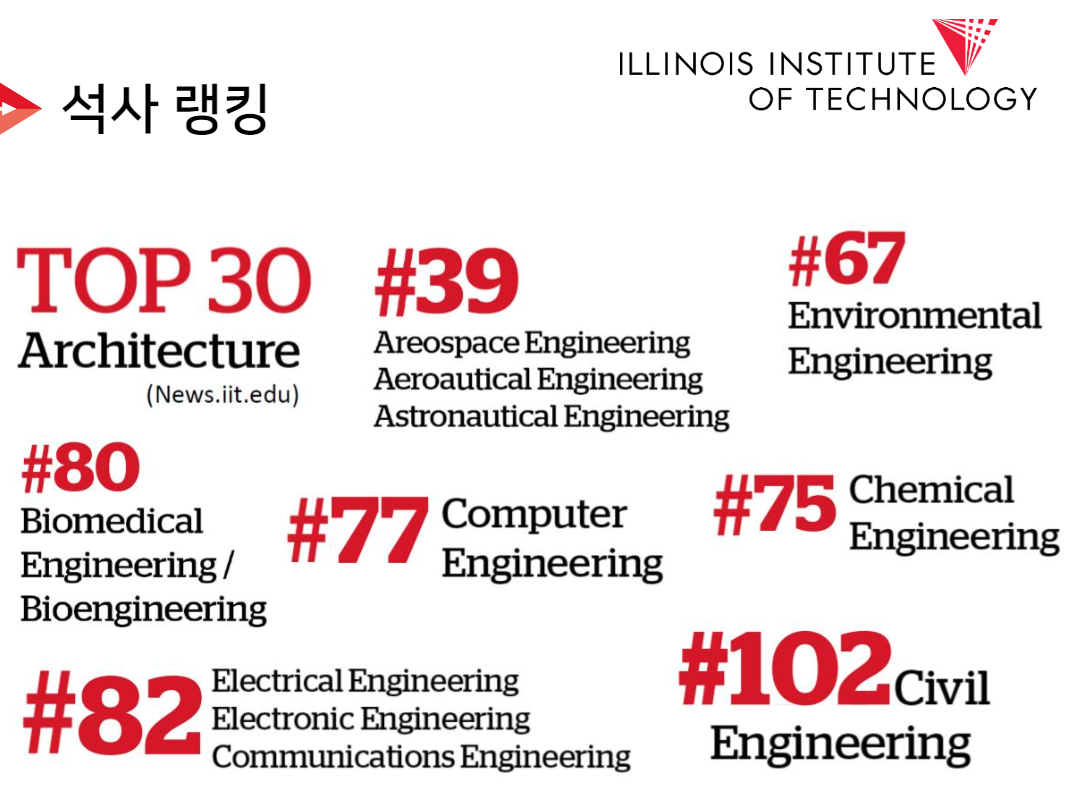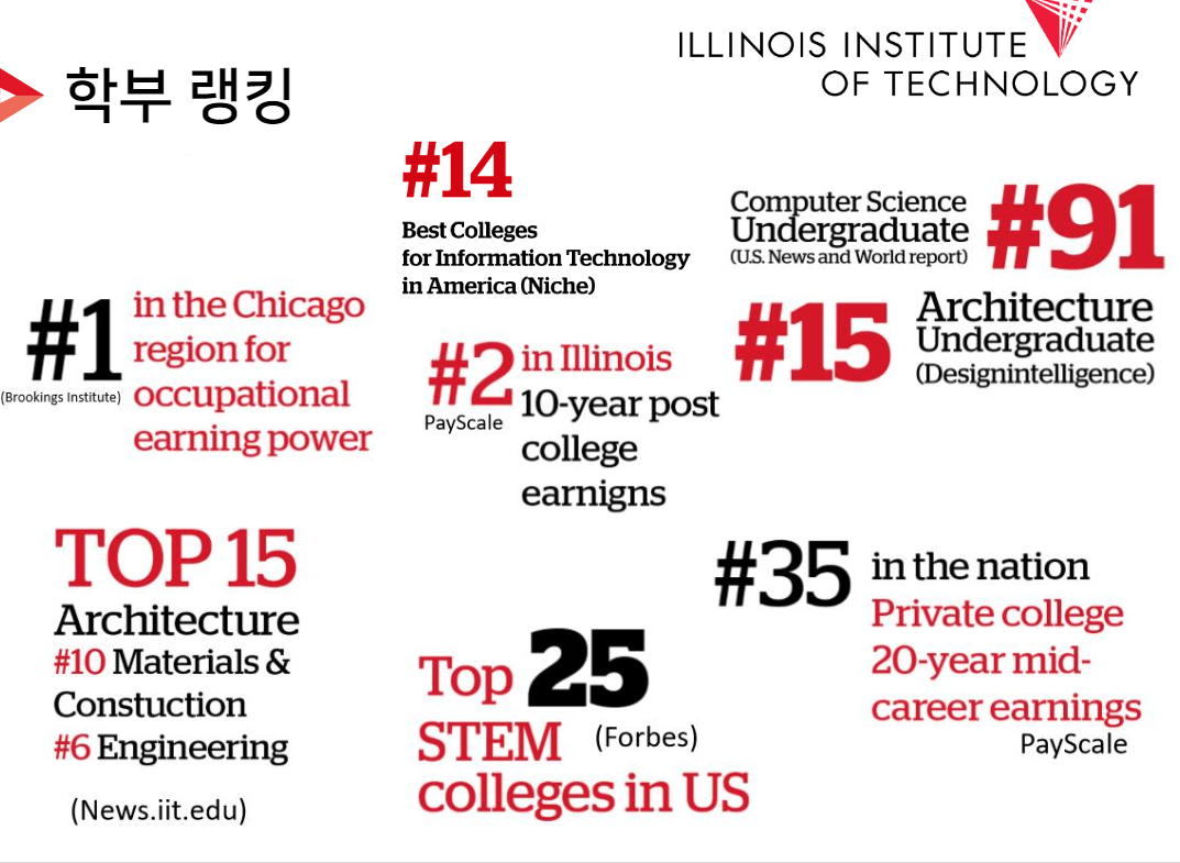 뿐만 아니라 컴퓨터 사이언스 졸업생의 연간 초봉은 $78,805로 일리노이 공대는 학비 투자 대비 졸업 후 연봉으로 미국 내 상위 5%에 속합니다. 따라서 대학 졸업 후 취업과 높은 연봉을 희망하는 학생에게 IIT 공학 및 사이언스 계열 전공을 추천합니다.