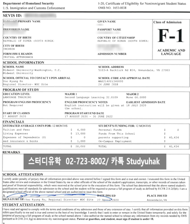 2020년 8월 수업 시작하는 임 * 학생은 Midwest University f1 어학연수 학생으로 , 2020년 상반기