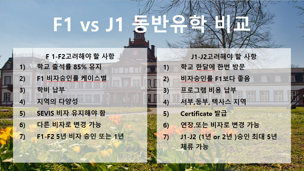 내용은 미국동반유학 시기와 지역 그리고 진행 비자 형태를 결정해야 합니다.