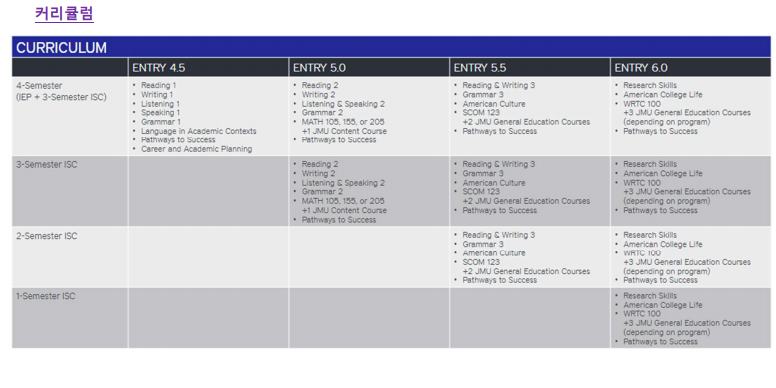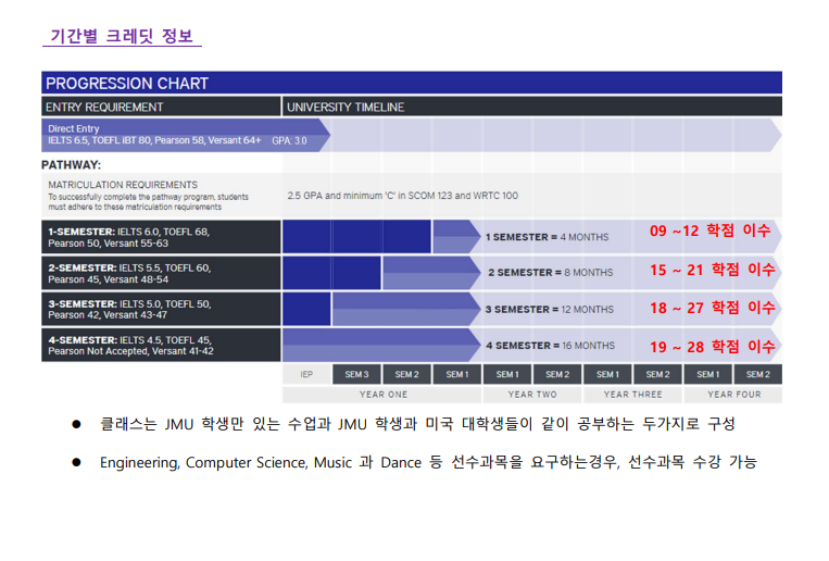 JMU 패스웨이 입학 기준(최저)International Year GPA2.25 / TOEFL iBT 45
