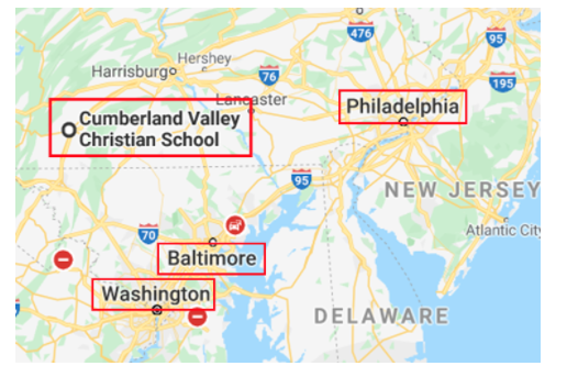 펜실베니아 남부 Chambersburg에 위치하고 있답니다. Chambersburg는 깨끗하고 조용하고,안전한 지역으로 조기 유학생들이 공부하기 너무 너무 좋은 지역입니다. 산과 숲이 이루어진 아름다운 경관을 자랑하는 도시 랍니다, 펜실베니아 남부에 위치하고 있어서 필라델피아 도시 보다 워싱턴 DC와 볼티모어(차로 1시간 40분거리)와 더 가깝답니다. 가장 가까운 국제 공항은 Harrisburg International Airport 이며 1시간 거리에 위치하고 있답니다.
