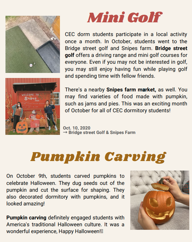 코넬이건 관리형 보딩 학생들 10월에는 엑티비티로 Mini golf와 Boston City Tour & College Tour(하버드, MIT)를 다녀왔다고 합니다. 또한 핼러윈을 맞아 pumpkin carving을 하여 기숙사를 예쁘게 꾸미기도 했다니 기특하네요~ 공부도 좋지만 잠깐 짬을 내서 이런 시간을 가져야 더 공부에 집중할 수 있겠죠~