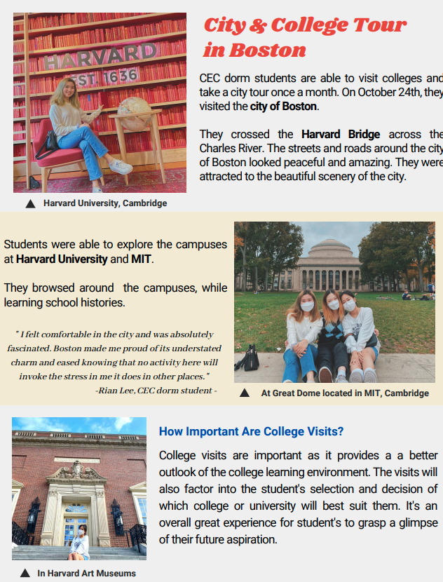 AnB Education에서 코넬이건 기숙사를 관리하고 있고, 재단 사무실에 1층에 위치하고 있어서 보딩 학생들은 언제든지 도움을 받을 수 있고, 기숙사내 수업, 주말 활동 그리고 영양가 있는 식단을 제공하고 있어서 안정적으로 학업에 집중할 수 있답니다. 코넬이건 보딩 하우스 Global Ambassador Club은 기숙사 학생들이 지난 10월 생활 소식을 전하는 Newsletter입니다.