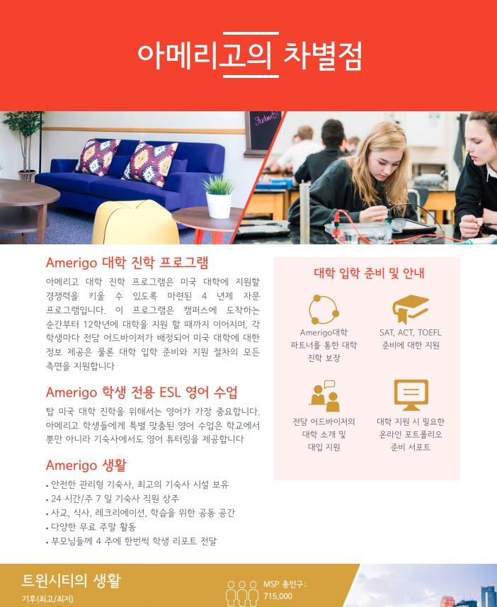 Cretin- Derham Hall High School은 Honors 및 AP 코스 약 47개 운영 ,28개 대학 프로그램 과 스포츠 개설 , 블루리본 지정 학교로 97% 졸업생들이 대학에 진학하고 있답니다.
