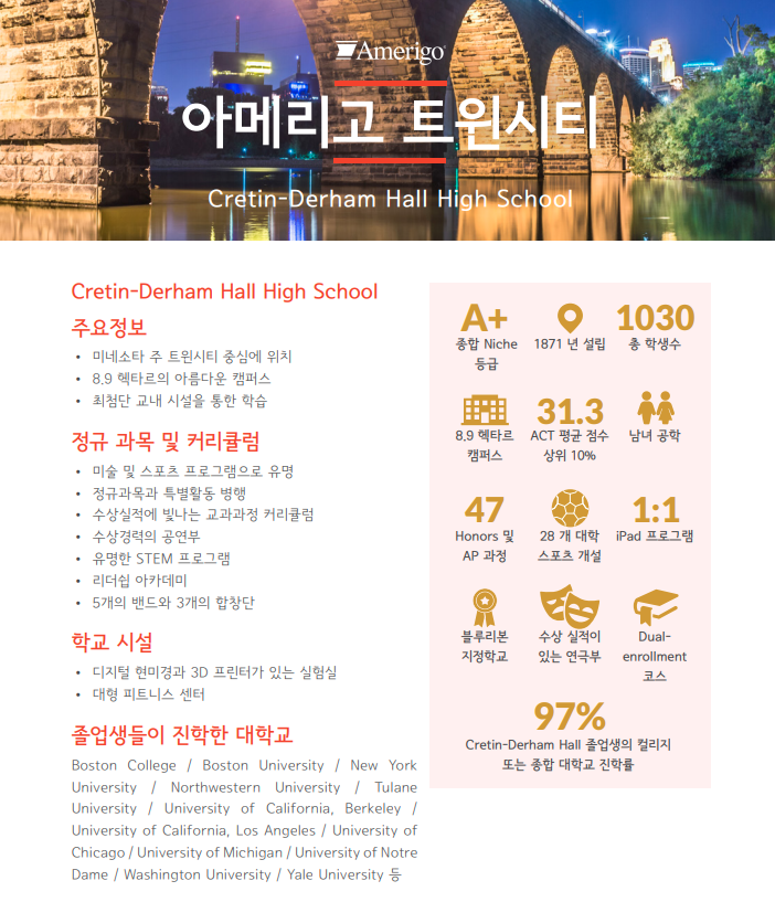 Cretin- Derham Hall High School은 미네소타 주 트원시티 중심에 위치하고 있으며 약 8.9 헥타르의 아름다운 캠퍼스, 최첨단 교내 시설을 자랑합니다. Niche 종합 A+ 등급의 학교로 매우 우수한 커리큘럼을 자랑하며, 총 학생수 1030명 입니다.