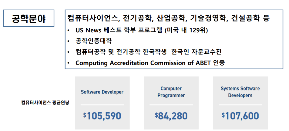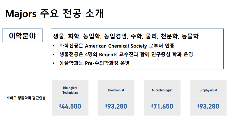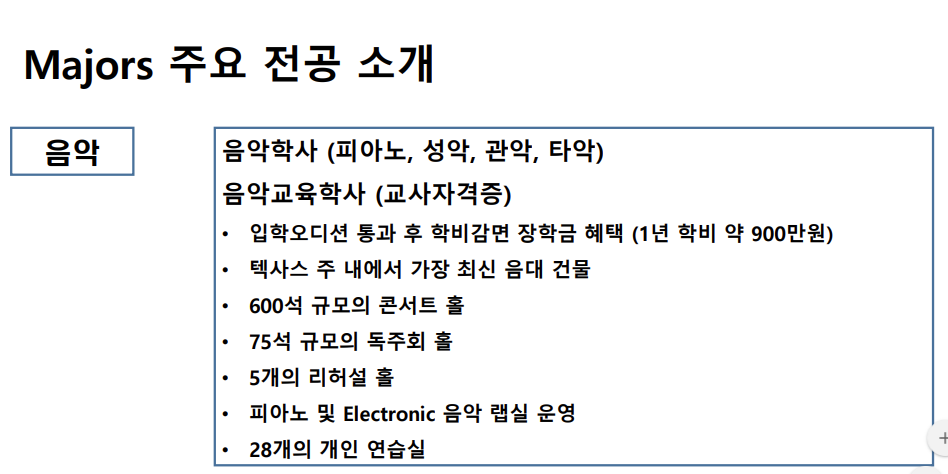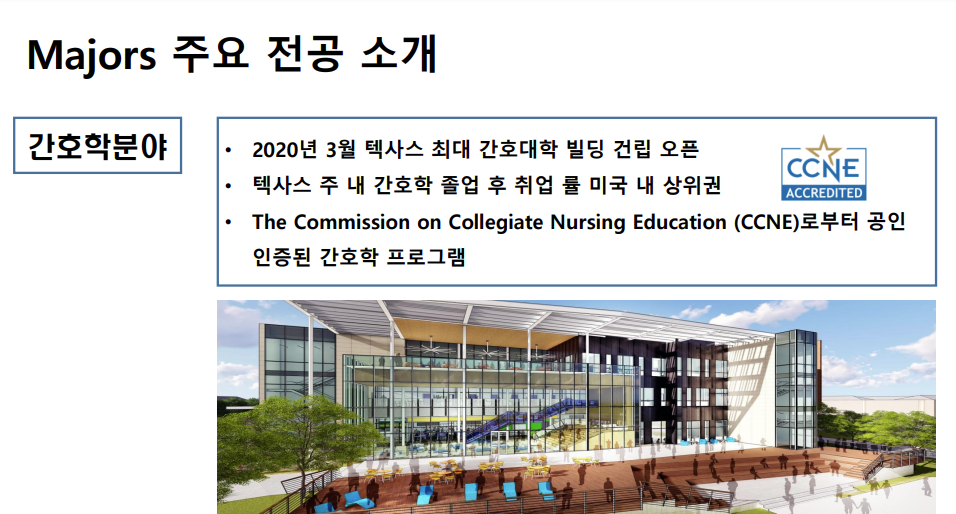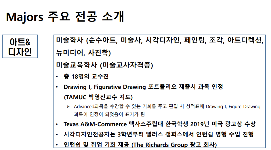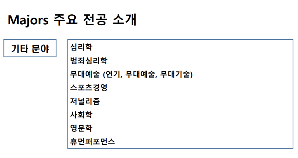주요 전공 : 회계학, 마케팅, 비즈니스 애널리스틱, 컴퓨터공학, 전기 공학, 생물, 화학, 아트&디자인, 음대, 무대예술, 심리학,