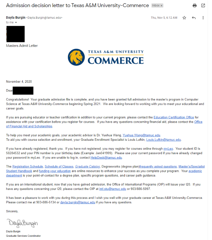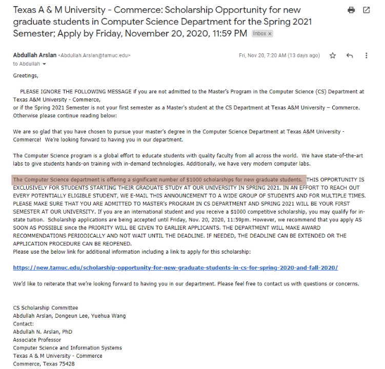 2020년 텍사스주립대 컴퓨터사이언스 석사과정으로 입학하는 김 ** 학생의 경우는 한국 건*대학을 졸업하고, 서울 텍사스 주립대 ELLTE 한국 교육원에서 6개월 이수와 동시에 토플 iBT80을 받고 Texas A&M Commerce 컴퓨터 사이언스 석사 과정에 입학과 동시에 $1000 장학금을 받았고, In State등록금이 적용되어 한 학기 학비가 한화 400만 원 이내로 한국 대학원보다 헐씬 저렴하게 미국 석사 과정을 배우게 되었답니다.