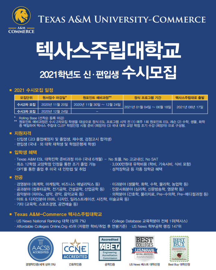 텍사스주립대 Texas A&M-Commerce을 졸업한 한국 학생들 100% 취업을 자랑하는 대학으로 국제학생이 학업하기 좋은 환경와 합리적인 비용으로 매년 많은 학생들이 입학하고 있답니다.