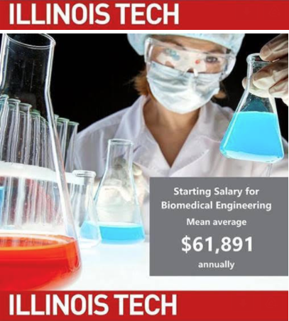 일리노이 공대는 미국 내 Top 엔지니어링 학사 프로그램으로 79위 상위권에 올라 있으며, 바이오메디컬 엔지니어링을 공부한 학생들은 Northwestern University, University of Michigan, University of Glasgow 석. 박사로 진학 또는 취업하는 학생은 졸업 후 연간 평균 초봉 $61,891을 받고 있답니다.