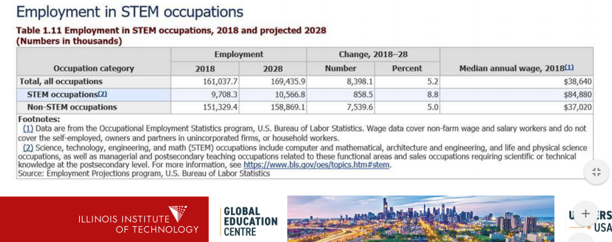 -미국 노동 통계국에 따르면 2018년 기준으로 2028년까지 STEM 관련 직종 고용은 8.8%가 더 늘어날 것으로 보고 있으며,2018년 기준 STEM 직종 연봉 $84,880으로 비 STEM 직종이 $37,020인 것과 비교하여 두배가 넘는 고수익을 자랑합니다