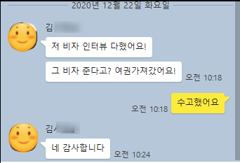 2020년 9월 인터뷰 준비를 다 해주시고 , 미국 학교에서 21년 봄학기 입학하라고 해서 스터디 원장님을 두 번 귀찮게 했는데 ~ 싫은 내색도 없이 (비용 추가도 없이) 끝까지 미국 비자 도와 주셔서 감사 드립니다. 친구 소개로 스터디유학을 알게 되서 너무 편하고 안전하게 미국비자 합격한 것 같아요 ~ 고맙습니다.