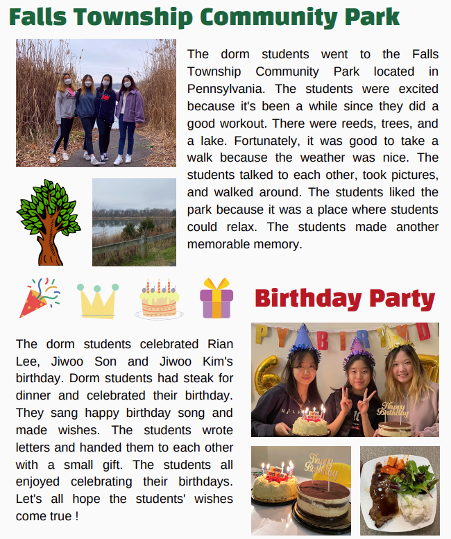 12월은 크리스마트 파티와 미국인 홈스테이 체험 그리고 Township Community Park 방문했다고 하네요.코넬이건 보딩스쿨 학생들은 코로나 바이러스에서 안전하게 공원 산책을 즐겁게 즐겼고, 우리 스터디 유학생 손**학생의 생일 파티로 스테이스를 먹으면서 생일 파티를 즐겼다고 합니다.