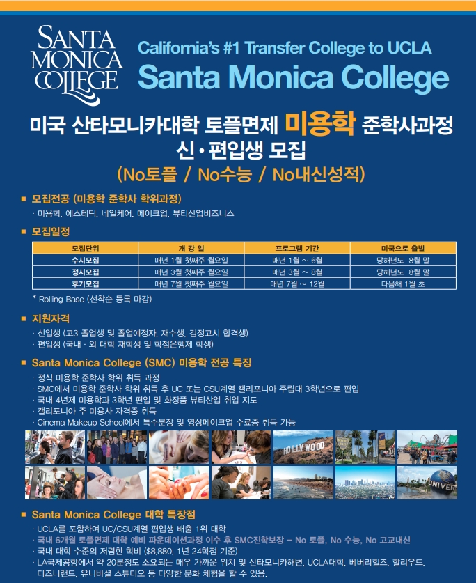 Santa Monica College 토플 면제 미용학 준학사 과정 신.편입생 모집