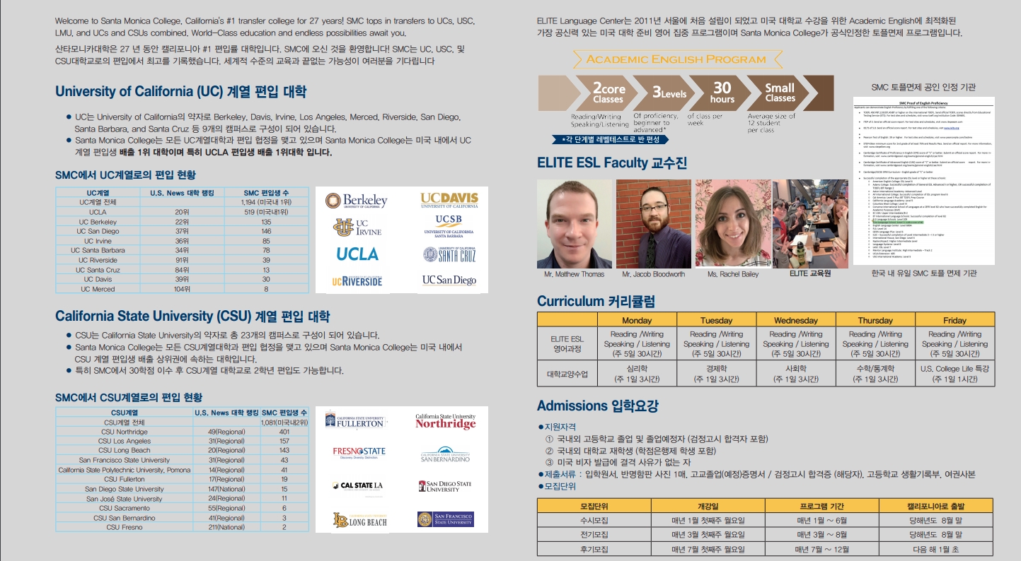 UCLA Transfer Pathways Program은 UCLA ELITE Language Center (Korea)에서 6개월 영어와 12학점을 취득후토플 면제 ESL & 대학 교양이수(1학년 1학기) 학점을 취득하고, Santa Monica College로 입학하여 UCLA 대학교양 및 기초 전공 이수(1.2학년) 학점 취득 후 UCLA 3학년 진학합니다.