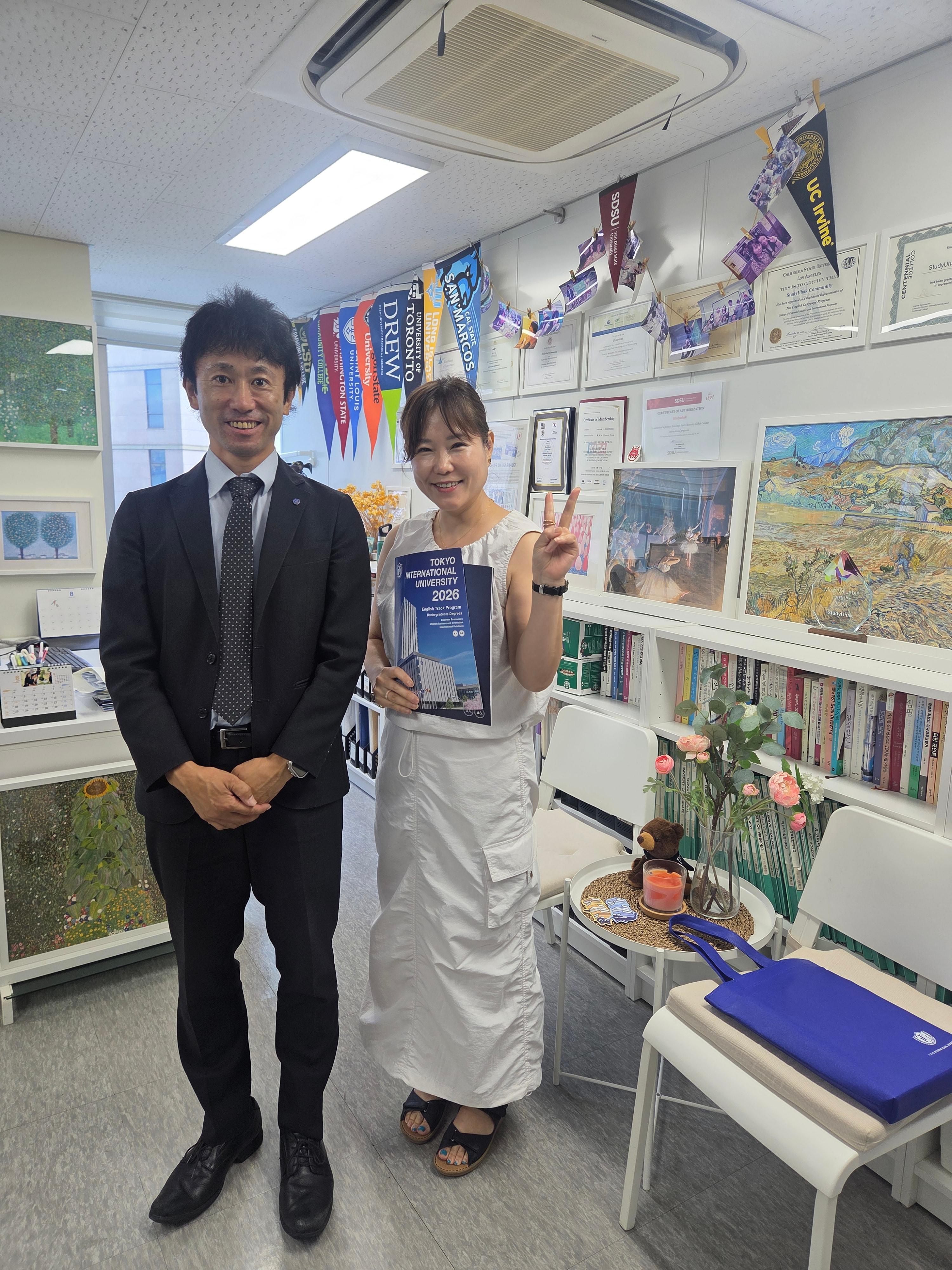 스터디 유학은 2025년 5월, 도쿄의 심장부 이케부쿠로에 위치한 도쿄국제대학교(TIU)를 직접 방문하여 입학 담당자 및 재학생들과의 심도 깊은 간담회를 진행하였고, 26년 8월 일본에서 만났던 입학 사정관 일본 선생님께서 스터디 유학을 방문해 주셨어요 ~